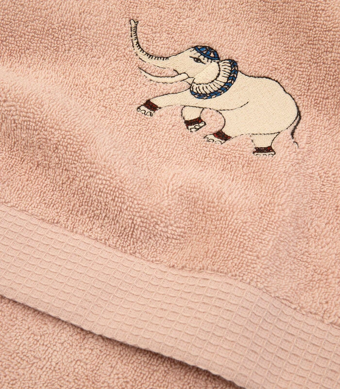 Geïnspireerd door traditionele Indiase patronen, wandelen hier geborduurde geluksolifanten licht op een gepoederde achtergrond.