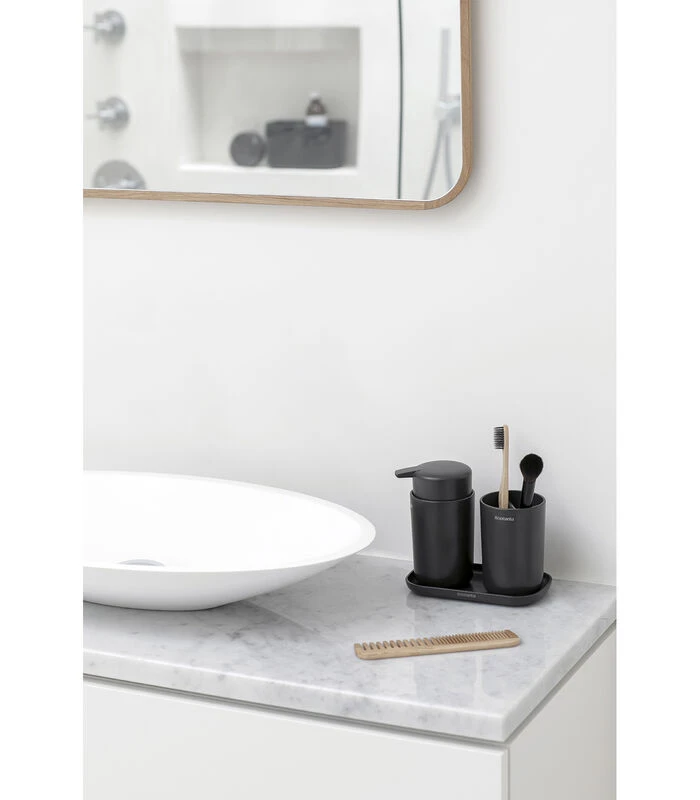 Maak van je badkamer een oase van rust met deze stijlvolle set van 3 Brabantia ReNew badkameraccessoires. Met de makkelijk te vullen en niet druppende zeeppomp heb je altijd je favoriete zeep bij de hand. De tandenborstelhouder houdt je tandenborstels en tandpasta bij elkaar. Gebruik de schaal om kleine dingetjes te bewaren of als onderzetter voor de andere twee. Een, twee, drie… een georganiseerde badkamer.