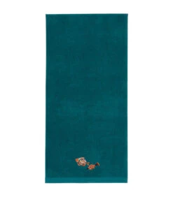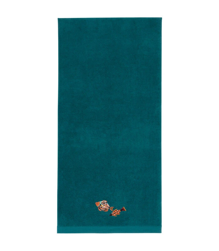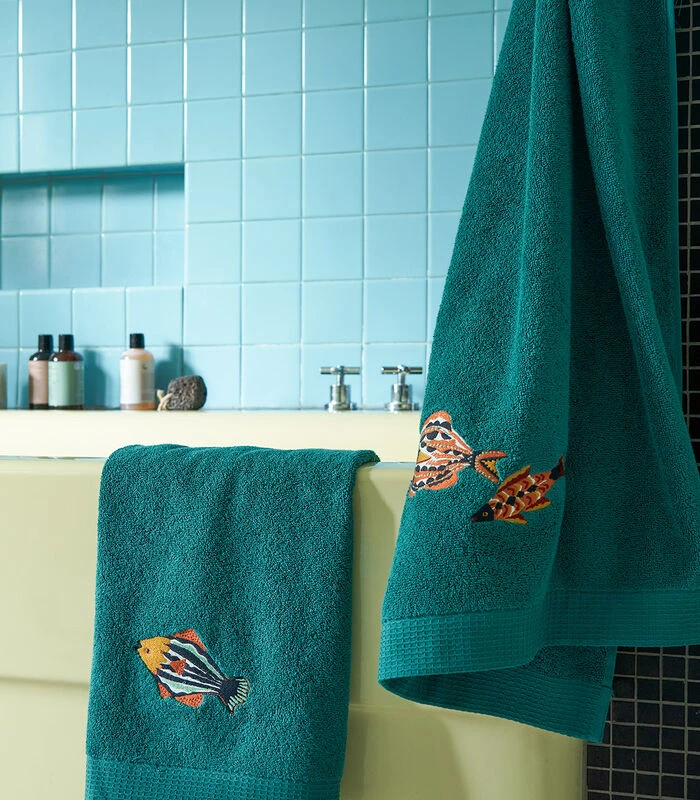 De eendenblauwe kleur brengt karakter en het borduursel van gekleurde vissen, geïnspireerd op de keramiek van Vallauris, vaart vrolijk mee.