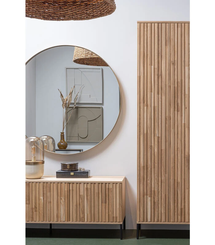 Deze royale ronde spiegel Doutzen komt uit de collectie van het Nederlandse merk WOOOD. De spiegel heeft een HRP sheet metal rand [hot rolled sheet metal], het is een staalplaat die warm gewalst is en geschikt is voor lassen. Dit materiaal wordt vaak in keukens gebruikt en is slijtvast. De stalen rand heeft een goudkleurige afwerking.