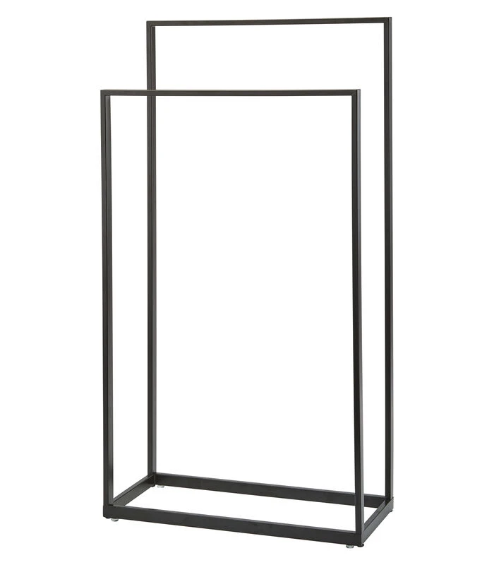 Een handige opberger voor de badkamer, slaapkamer of inloopkast. Dit handdoekrek YURI van Aquanova is gemaakt van zwart gepoedercoat staal. Het rek heeft 2 niveaus (hoogte 72 cm / 83 cm) met een breedte van 45 cm. Veel ruimte dus voor het ophangen van kleding of handdoeken.