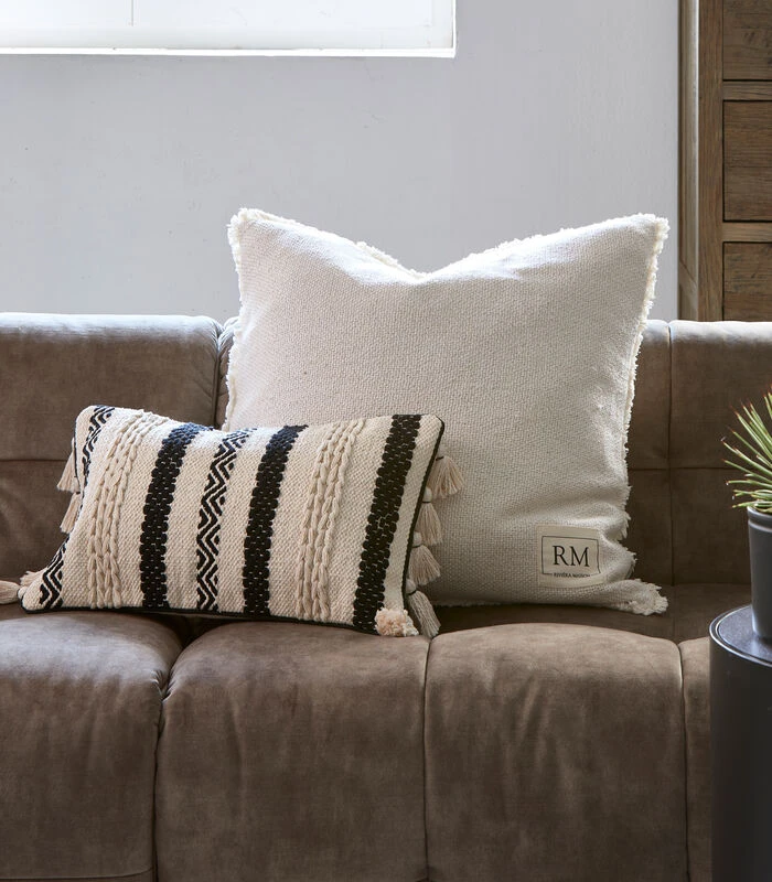 De RM Ko Olina Pillow Cover 50×30 is een kussenhoes die past om ieder binnenkussen van 50×30 centimeter. De stoere hoes is gemaakt van grof gebreid katoen met verschillende patronen in zwart en wit. De kussenhoes heeft een donkere bies en aan beide korte zijden zijn kwastjes bevestigd.