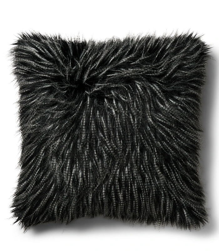 Springende zwarte en witte veren vormen de basis voor de Imani–kussenhoes van imitatiebont. De achterkant van het industriële kussen is gemaakt van zacht velvet en via een rits die over het kussen loopt, kun je het binnenkussen uit de hoes halen. Exclusief binnenkussen.