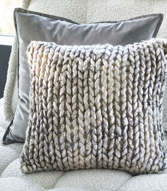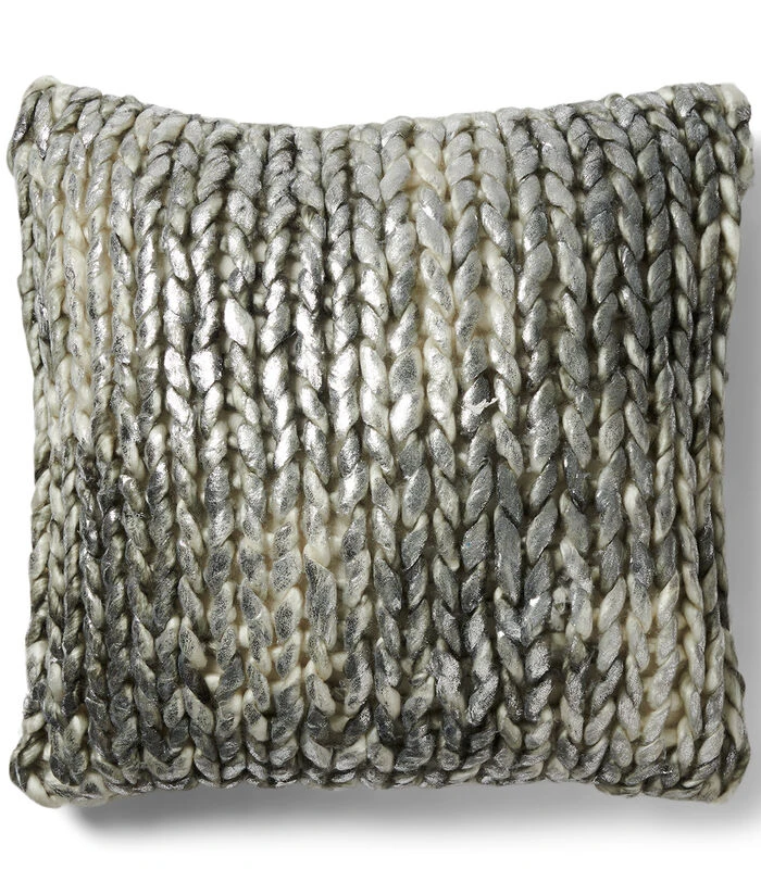 Met de RM Vilvre–kussenhoes haal je een stoer en tegelijkertijd zacht kussen in huis. Aan de voorkant van het kussen zijn grove, zilveren strengen van glanzend acryl in banen gevlochten. De achterkant van het kussen is van effen wit katoen. Exclusief binnenkussen.