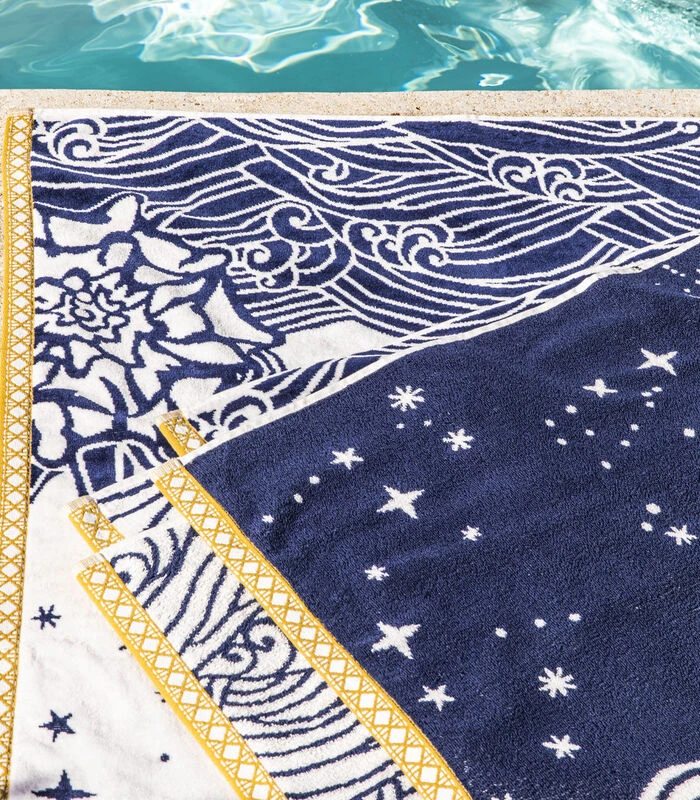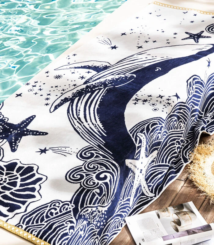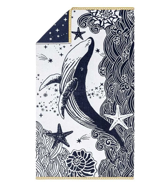 Het strandlaken is het essentiële zomer accessoire Een omkeerbaar model, het superzachte strandlaken, zeer aangenaam na een paar keer duiken… De Grand Bleu onthult een walvis, het emblematische en magische schepsel van de zee. Een echte duik in de oceaan.