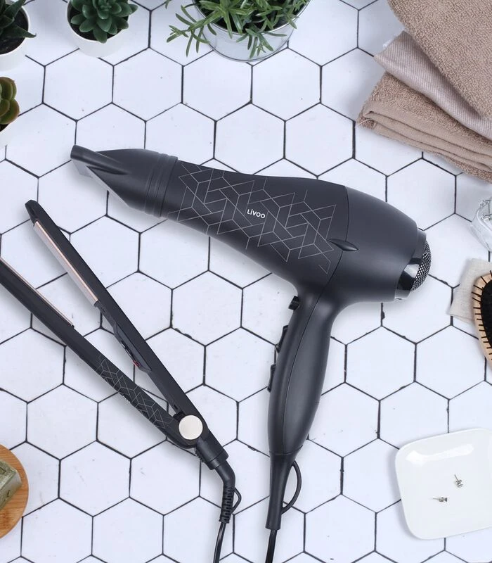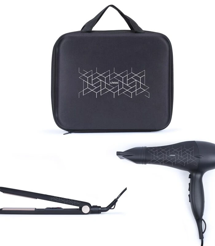 Haardroger met 2 snelheden en 3 temperatuurinstellingen met cool shot–knop en concentrator. Stijltang met keramische platen van 90×25 mm, temperatuur tot 230 ° C en roterend snoer. Nylon draagtas.