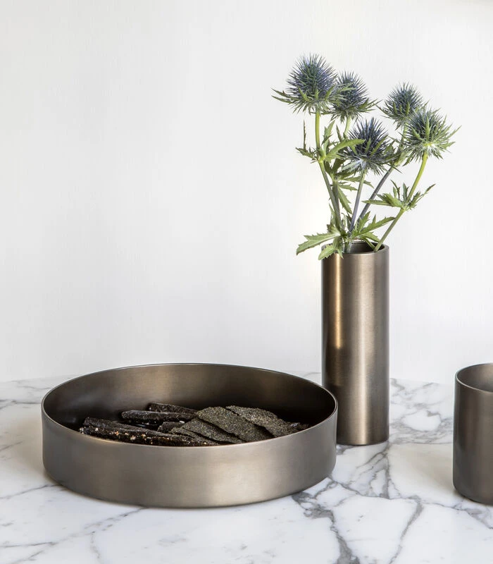 Vazen worden doorgaans gemaakt uit glas of porselein. Noella daarentegen is handgemaakt uit staal, bedekt met een laagje zacht koper, mat zwart of matte messing. Â De kleuren van de vaasjes maken elke bos bloemen tot een ware eyecatcher.