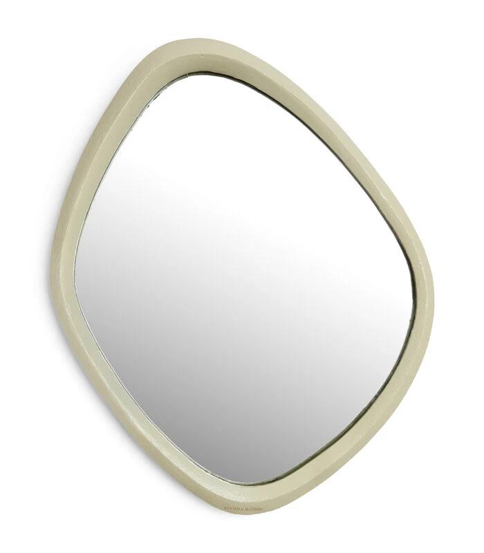 De RM Forest Mirror is een moderne wandspiegel met een organische, niet–symmetrische vorm. De bijna ovale spiegel heeft een zandkleurige rand van aluminium waar structuur in te zien is. Onderaan op de lijst staat ‘Rivièra Maison’ geschreven.