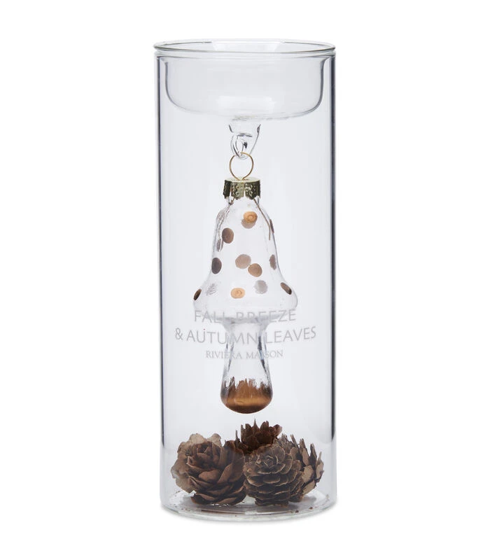 Nieuw in onze RM Loves collectie: RM Fall Breeze theelichthouder. De houder bestaat uit een glazen stolp. Een transparante paddenstoel met gouden stoppen. Bovendien is de votief versierd met dennenappels. Er past een waxinelichtje op voor een gezellig moment voor twee of met z’n allen. Deze transparante votief is gemaakt van glas. Let op: de waxinelichthouder is breekbaar! Afmetingen; (ØxH) 6,5×15 cm