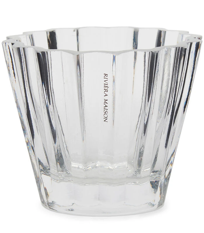 De RM Folded Votive is een waxinelichthouder gemaakt van gegolfd glas. Het glas is helder en transparant. Het design doet denken aan een muffinvorm. Door deze vormgeving krijgt het waxinelicht een sfeervol effect. Op de zijkant is ‘Rivièra Maison’ te lezen.