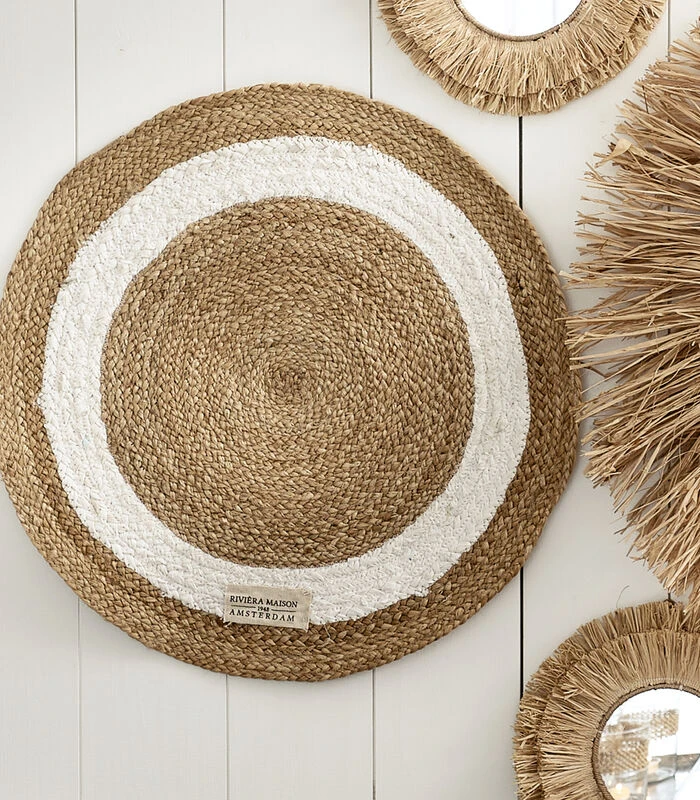 Het Rocat ronde tapijt in natureltint is gemaakt van gevlochten jute en katoen dat vastgestikt is. Het jute is bruin van kleur en het katoen wit. De witte baan in het tapijt geeft het vloerkleed een fris en modern uiterlijk. Hetzelfde design zien we bij Rivièra Maison ook terug bij andere formaten vloerkleden van jute.