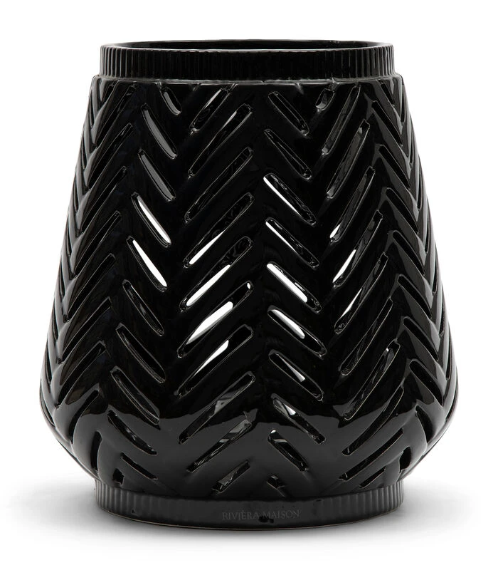 De RM Herringbone Hurricane black is een zwart windlicht met een mooie glans. Dit komt door de glazuurlaag die op het keramiek is aangebracht. De grote kaarshouder heeft een visgraatpatroon. Door de openingen kan het kaarslicht sfeervol naar buiten schijnen. Op de bodem van het windlicht staat ‘Rivièra Maison’ geschreven.