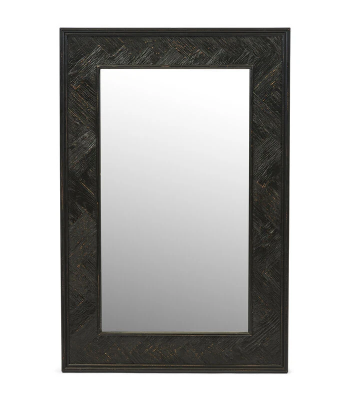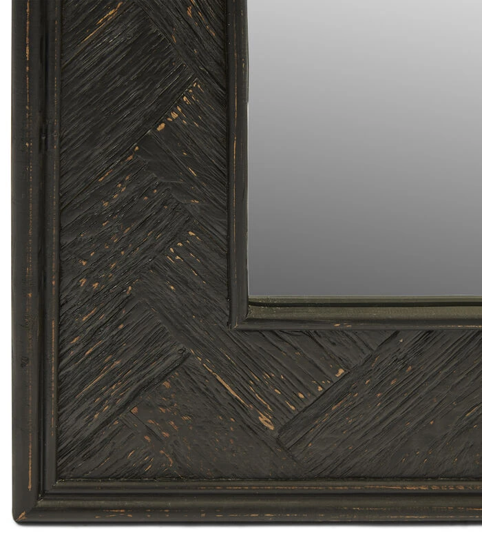 De Yosemite Mirror is er in twee formaten. Dit is de variant van 120 x 80 centimeter. De royale, rechthoekige spiegel heeft een chique lijst van gerecycled eikenhout in een zwarte tint. Het hout is ingelegd in visgraatpatroon. De spiegel is 5 centimeter diep.