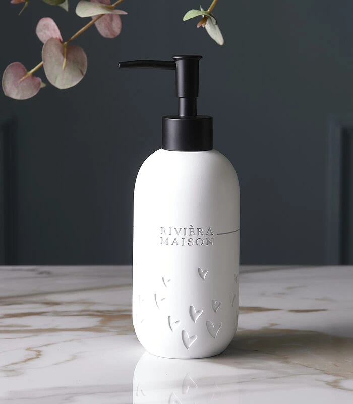 De Lovely Heart Soap Dispenser is een wit zeeppompje met zwarte details en een bijzondere decoratie. In het badkameraccessoire zijn namelijk de tekst ‘soap’ en hartjes gedrukt. Hierdoor krijgt het mat witte zeeppompje reliëf.