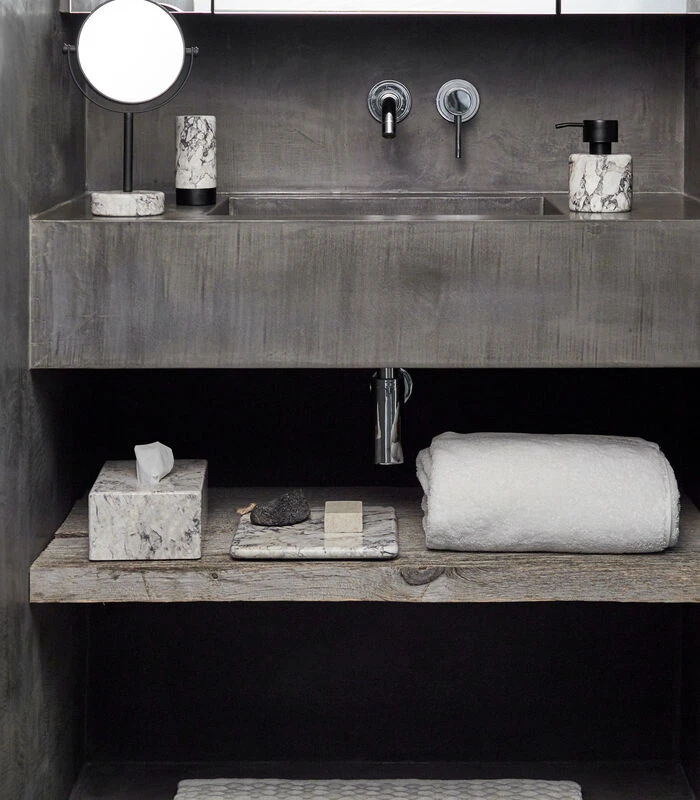 Natuurlijk en stijlvol; de Nero serie van Aquanova bestaat uit handgemaakte badkameraccessoires van natuursteen. De combinatie grijstinten en zwarte kenmerken maakt deze serie uniek! Tip: mooi te combineren bij een betonlook muur of vloer.